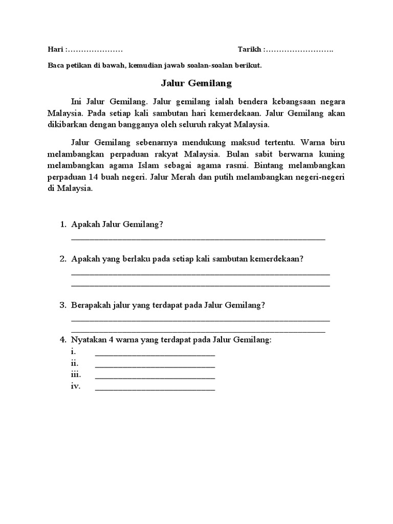 Jalur Gemilang Hari Tarikh Baca Petikan Di Bawah Kemudian Jawab Soalan Soalan Berikut
