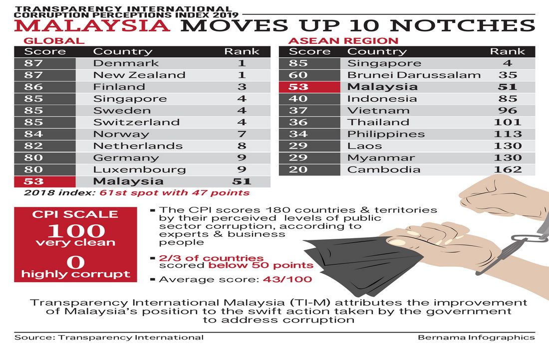 Malaysia rose to 51st place in ti s 2019 cpi with an increase of 53 points compared to its 61st ranking in 2018 with a score of 47 points. One of the most well known and prominent cases of corruption within malaysia and globally is that involving the former prime minister of malaysia najib razak known as the 1 malaysia development fund bhd 1mdb. Asia pacific global corruption barometer publication bullet.