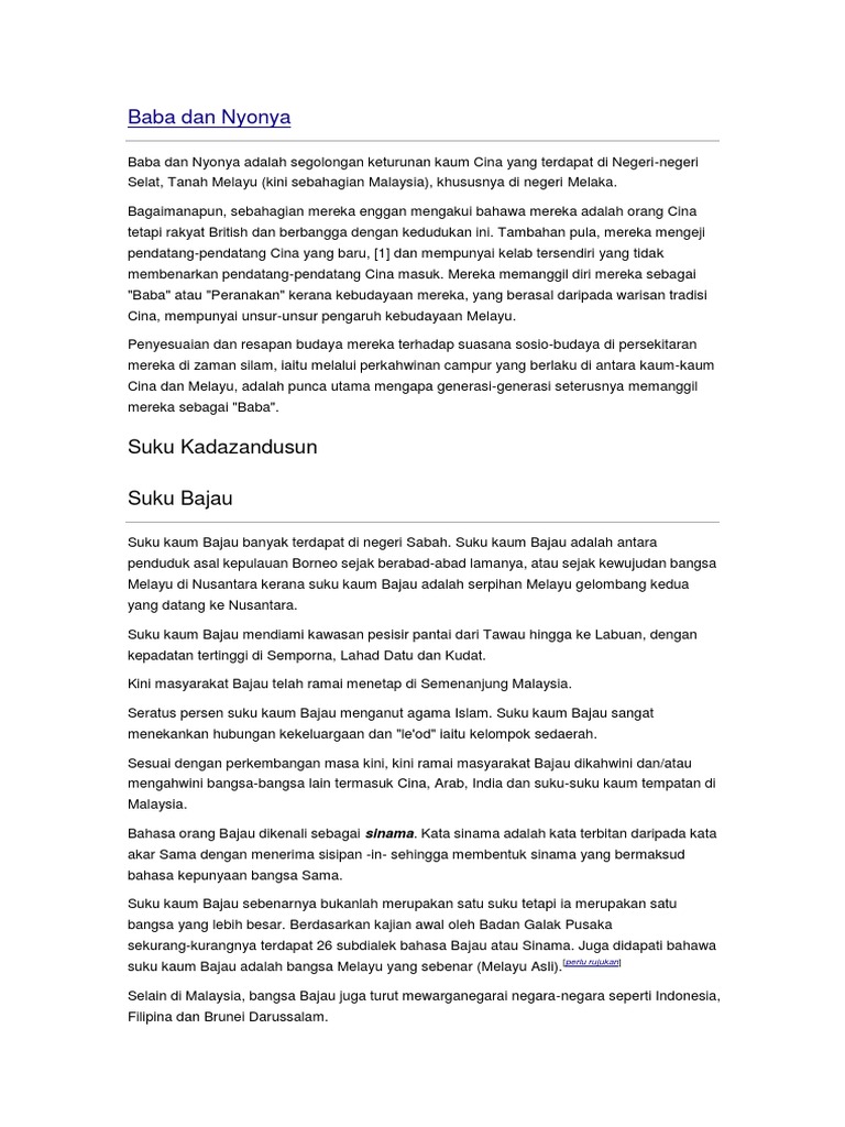 Hubungan etnik di malaysia. Selama lebih 150 tahun kelompok etnik minoriti itu menambah rencah kepelbagaian kaum dan budaya di melaka. Selain itu malaysia juga merupakan tanah air kepada sebanyak kira kira 80 kaum etnik terutamanya di malaysia timur antaranya termasuklah baba dan nyonya kadazandusun dan iban.